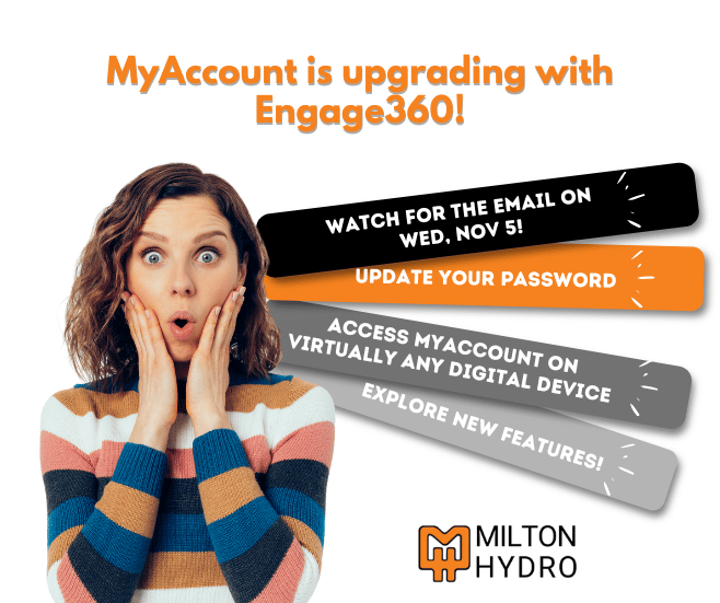 Milton Hydro is upgrading the MyAccount online portal to provide customers with a more intuitive and powerful experience. The new platform, powered by Engage360, offers real-time billing, integrated generation and consumption data, Apple and Google account sign-in, and an easy-to-use price plan comparison tool.