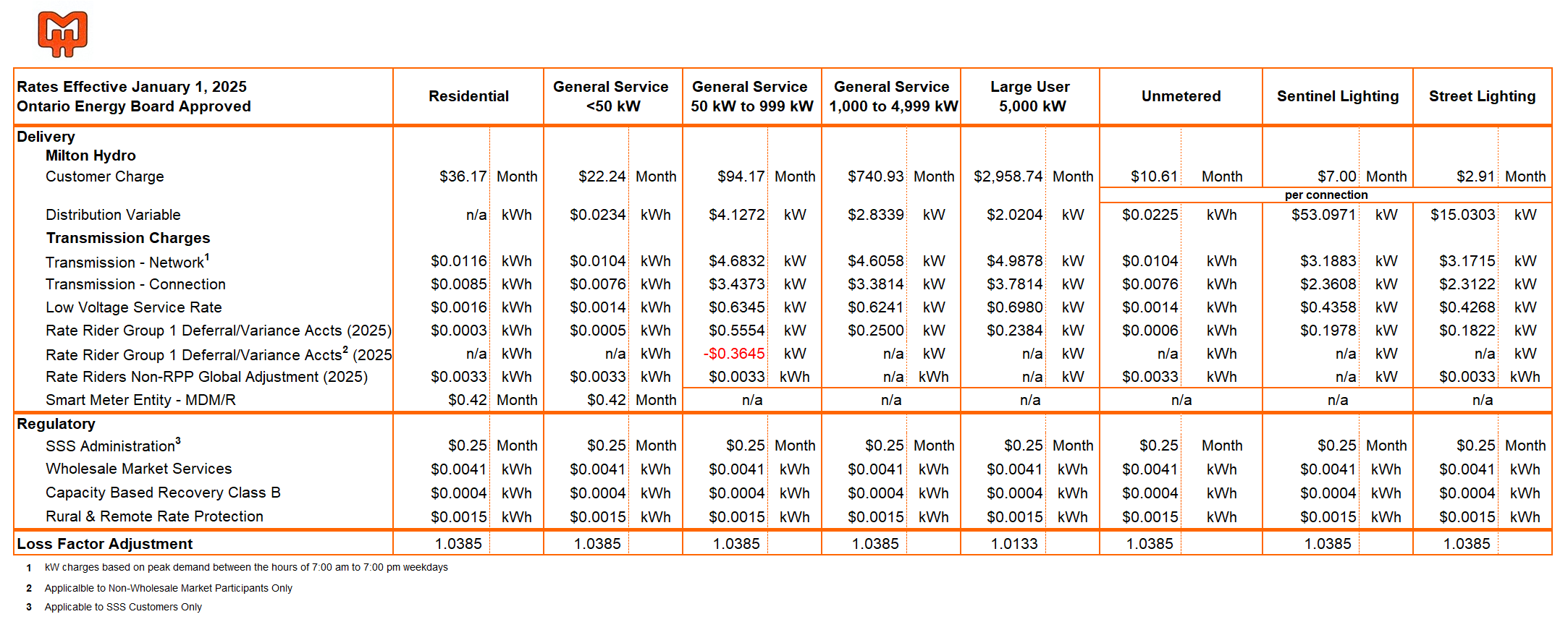 Click the button below to view Milton Hydro's complete Winter 2024/2025 Rate Schedule: